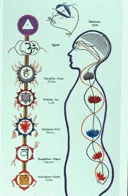 Bild: Kroppens grundläggande subtila elektro-magnetiska system genomtränger den fysiska kroppen och är grunden för dess funktionalitet. Sju centra, chakras, ”hjul”, fungerar som transformationstationer och överför data (information) från det fysiska planet till det andliga planet, och data (information) från det andliga planet till hjärnan och det fysiska nervsystmet.